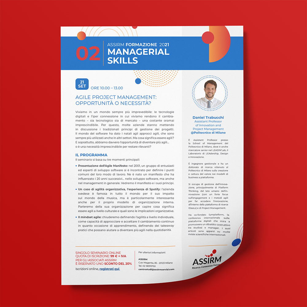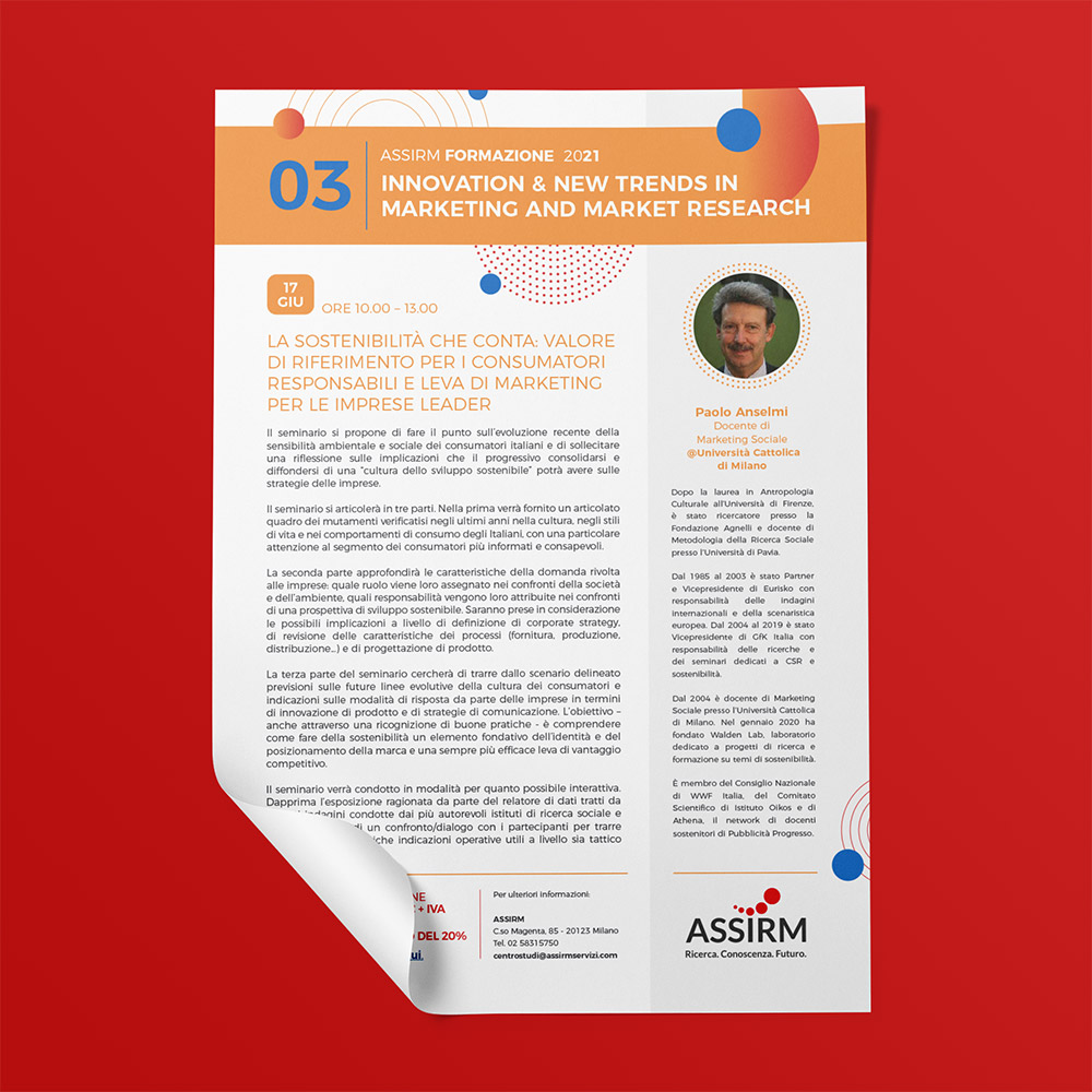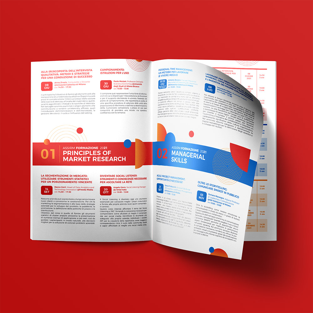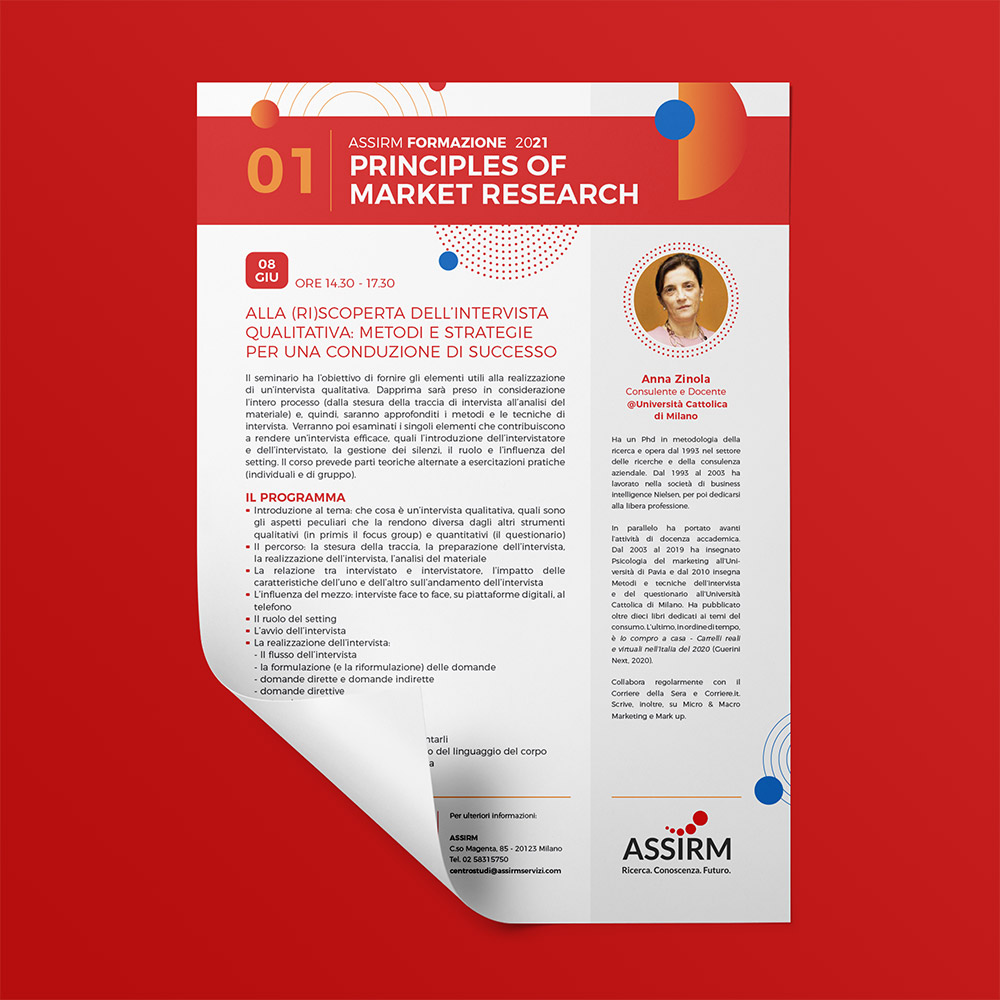 Assirm è l’Associazione che riunisce le aziende italiane che svolgono Ricerche di Mercato, Sondaggi di Opinione e Ricerca Sociale. Per loro mi sono occupata dell’intera veste grafica della nuova proposta di Formazione per il 2021.